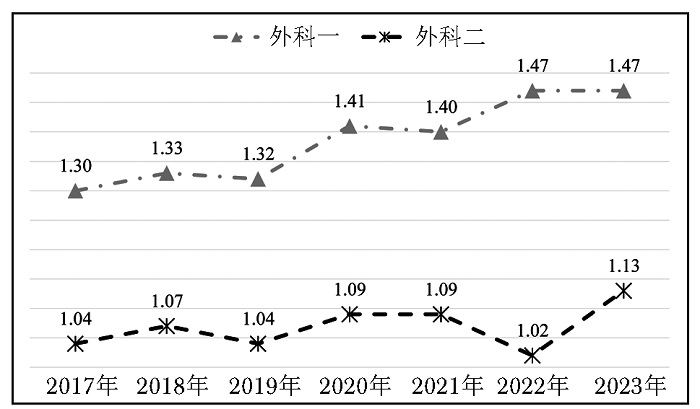 Methods We retrospectively collected DRG data from two surgical departments in a large public hospital in Beijing from 2017 to 2023. When the case mix index (CMI) of the two surgical departments declined, interventions such as performance appraisal, department education, and hospital publicity were promptly adopted. The changesin CMI values were observed and the trends in disease group weights, time consumption index, cost consumption index, and mortality rate in low-risk groups were analyzed.