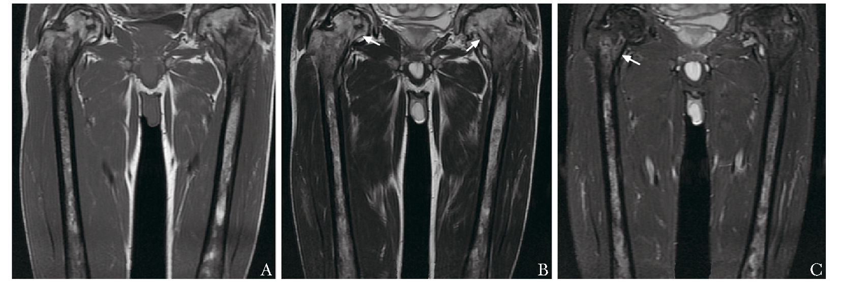 图 3 1例男性戈谢病患者,42岁,双侧股骨MRI示骨髓T1WI(A)、T2WI(B)高信号降低,脂肪抑制T2WI(C)可见骨髓为弥漫高低混杂信号,左侧股骨头塌陷,右侧股骨头及股骨颈可见多发骨梗死(箭头)
