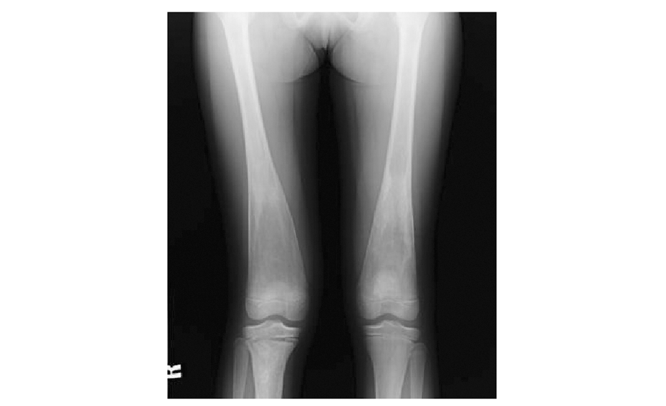 图 2 1例女性戈谢病患者,12岁,双侧股骨X线示骨质密度减低,远端膨大呈典型的“锥形瓶样”改变