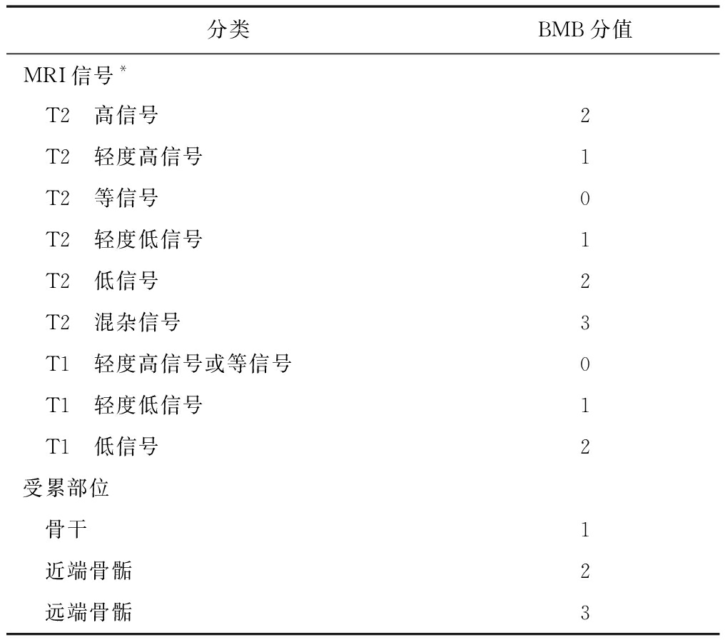 分类BMB分值MRI信号* T2 高信号2 T2 轻度高信号1 T2 等信号0 T2 轻度低信号1 T2 低信号2 T2 混杂信号3 T1 轻度高信号或等信号0 T1 轻度低信号1 T1 低信号2受累部位 骨干1 近端骨骺2 远端骨骺3